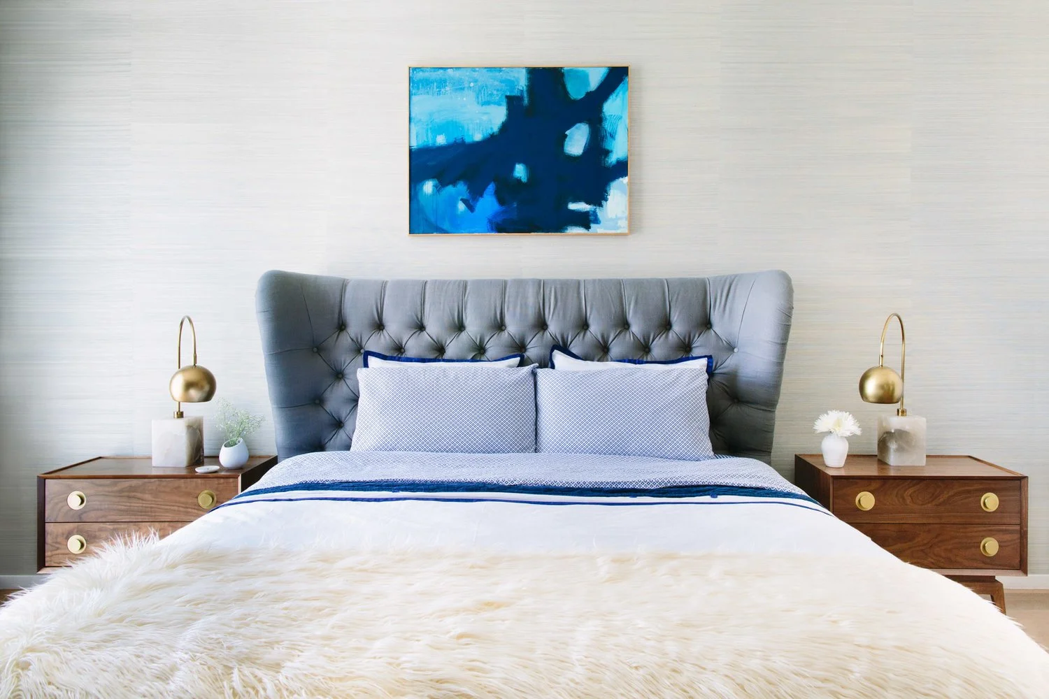 Combining sleek mid-century modern pieces with glamorous yet understated components created an eclectic look that reads both fresh and soulful. A woven grasscloth wallpaper and beautifully layered bedding creates both visual and tactile texture, making the neutrals exciting.