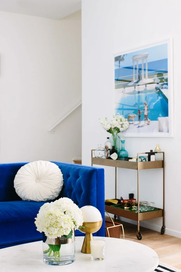 Starting with a clean white canvas in this new construction space, we strove to simultaneously celebrate its angular lines as well as create a sense of comfort. We achieved a totally livable, modern design through a thoughtful selection of sophisticated contemporary pieces, serene tonal elements and pops of brilliant blue.